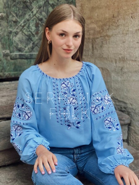 Жіноча блакитна вишиванка на лляній тканині з квітковою вишивкою “Оріяна”