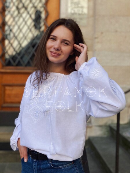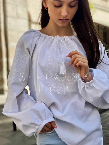 Жіноча блуза вишиванка білим по білому з геометричним орнаментом “Шанті”