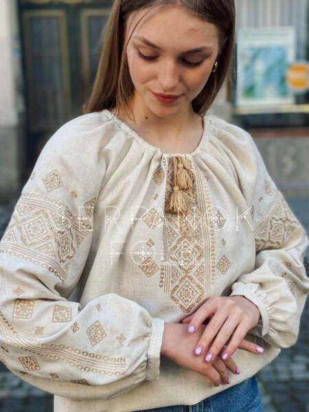 Жіноча класична бежева вишиванка з геометричною вишивкою “Трояна”