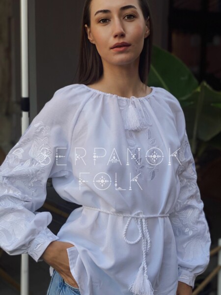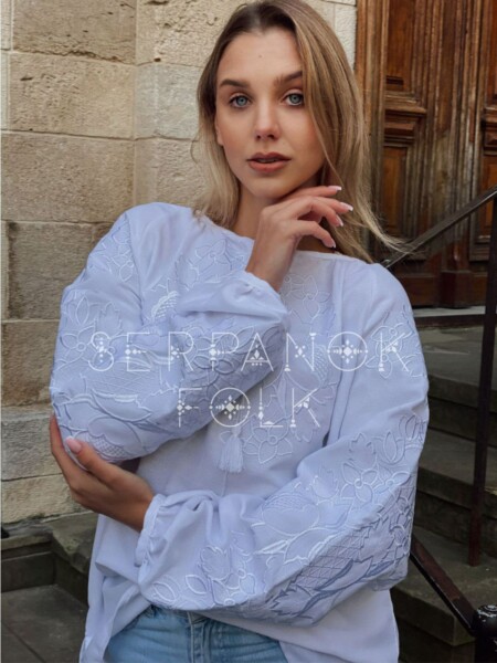 Святкова жіноча білим по білому блуза вишиванка з квітковим орнаментом “Моніка”