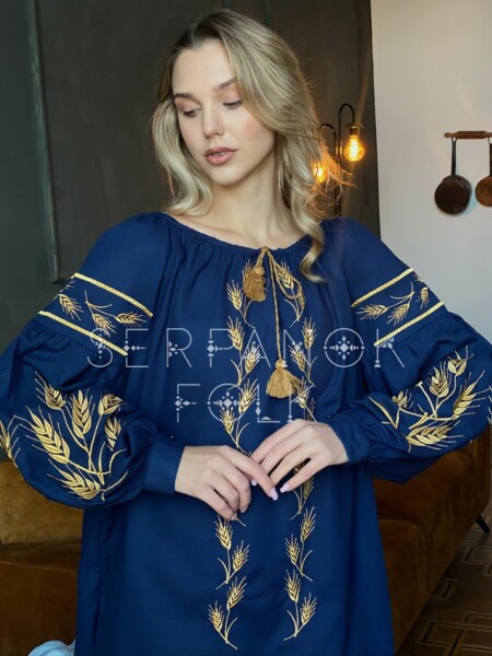 Українська темно синя жіноча вишита блуза з колосками на лляній тканині “Уляна”