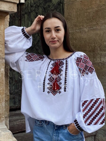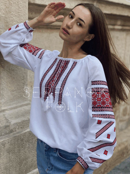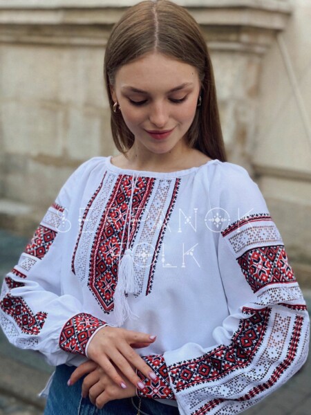 Українська біла вишиванка на домотканому полотні з червоним орнаментом “Лінда”