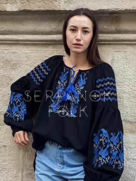 Чорна вишукана жіноча вишиванка на домотканому полотні “Ластівки щастя”
