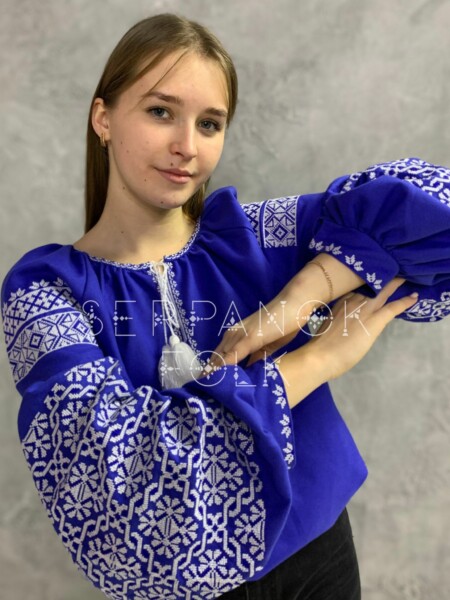 Яскрава синя жіноча вишиванка в стилі бохо на домотканому полотні “Тайстра”