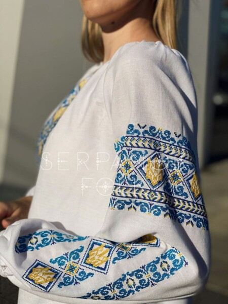 Українська біла патріотична жіноча вишиванка на бавовняній тканині “Світлозара”