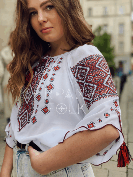 Українська традиційна біла жіноча вишиванка з червноною вишивкою “Кейсі”