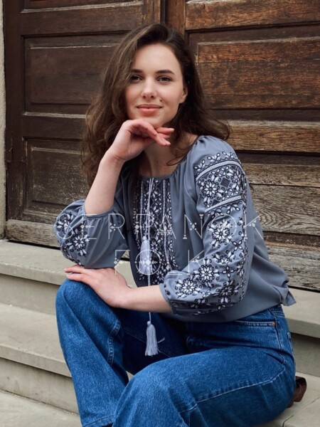 Стильна сіра жіноча блуза вишиванка з геометричною вишивкою на шифоні “Амелі”
