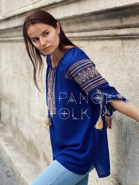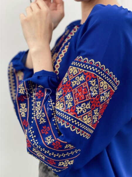 Стильна насичено синя українська жіноча вишита блуза на легкому шифоні “Венеція”