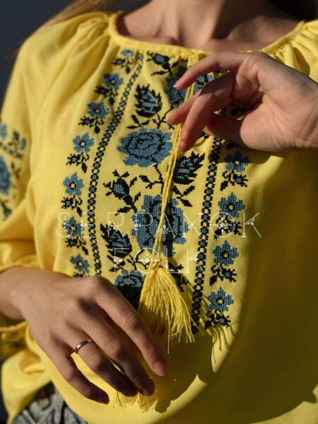 Українська легка жовта шифонова жіноча вишита блуза з синіми трояндами “Розалія”