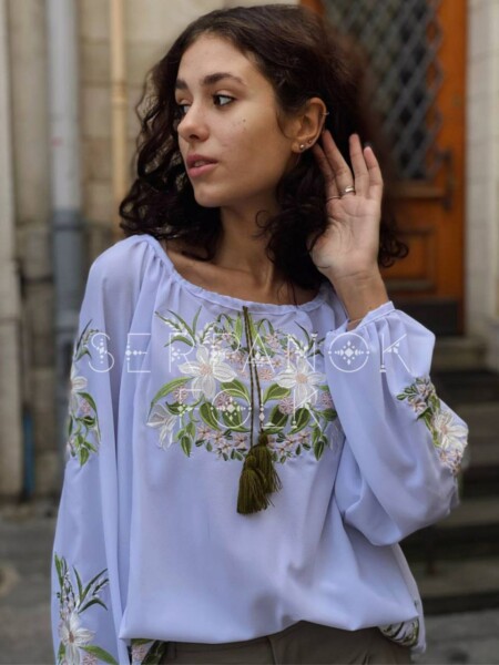 Українська легка біла жіноча блуза вишиванка на шифоні з крученим паском “Лілея”