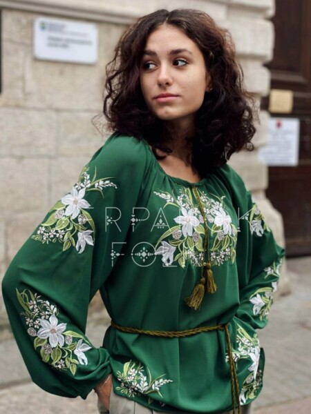 Традиційна зелена квіткова жіноча вишиванка на легкому шифоні з паском “Лілея”