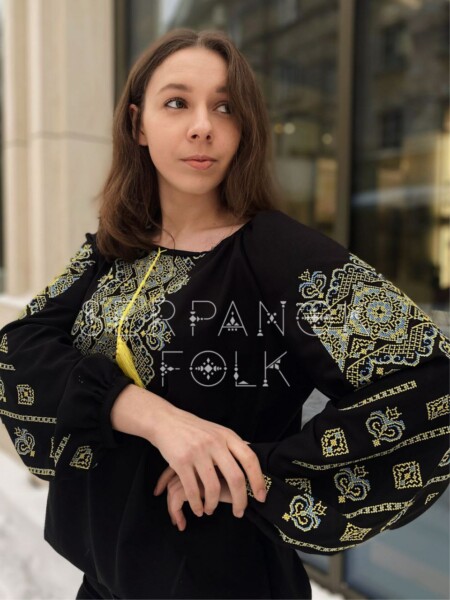 Традиційна чорна жіноча шифонова вишита блуза з геометричною вишивкою “Марсела”