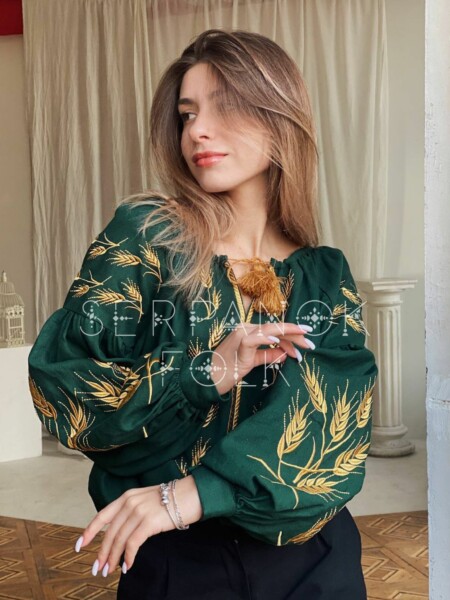 Елегантна зелена жіноча вишиванка в стилі бохо з золотими колосками “Уляна”