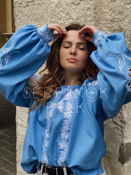 Квіткова блакитна жіноча вишиванка рішельє на домотканому полотні “Роксана”