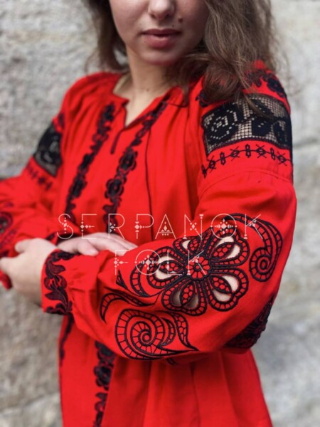 Квіткова українська червона жіноча вишиванка з чорною вишивкою рішельє “Роксана”