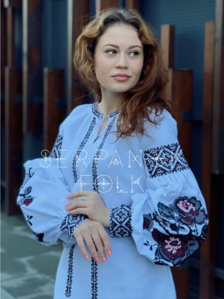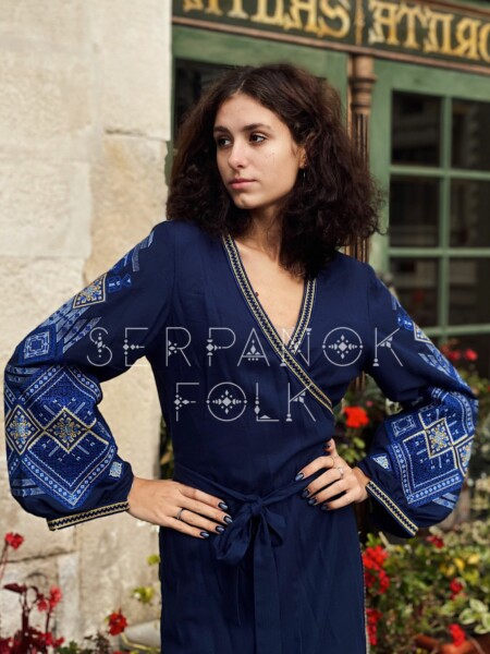 Класична синя жіноча сукня вишиванка на лляній тканині на запах “Магдалина”