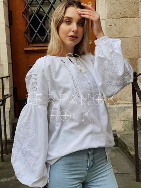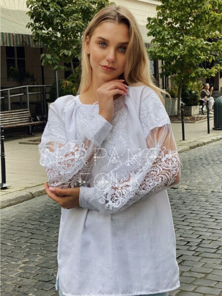 Ніжна вишиванка жіноча блуза з вишивкою білим по білому з решетилівкою “Олімпія”