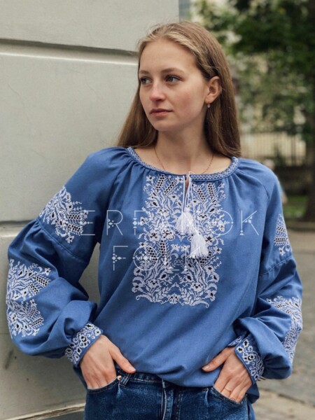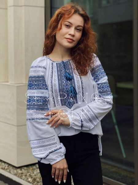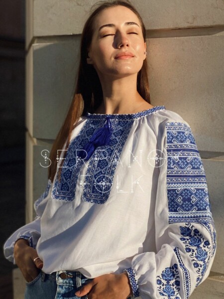Біла жіноча блуза вишиванка з синьою геометричною вишивкою “Чаруня”