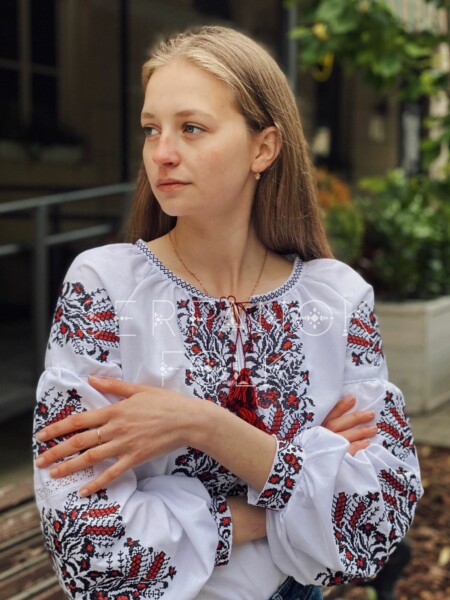 Офісна біла жіноча блуза вишиванка з українською вишивакою “Забава”