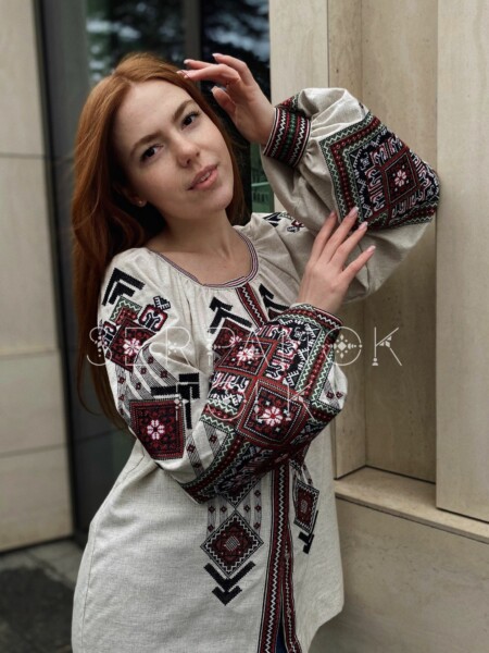 Бежева жіноча вишиванка на лляній тканині з геометричною вишивкою “Сабріна”