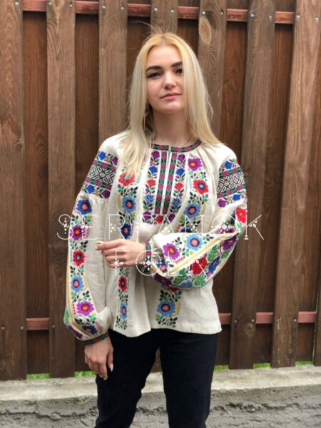 Квіткова жіноча вишиванка з борщівською вишивкою на лляній тканині “Поліана”