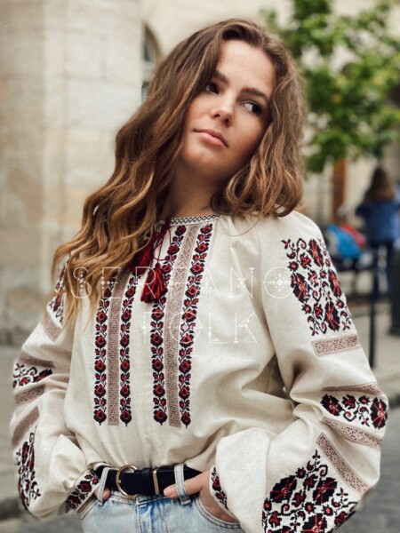 Ексклюзивна жіноча вишиванка кольору льону на домотканому полотні “Радмила”