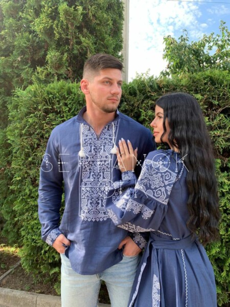 Парні вишиванки сині з білою вишивкою на лляній тканині “Жарптиці щастя”