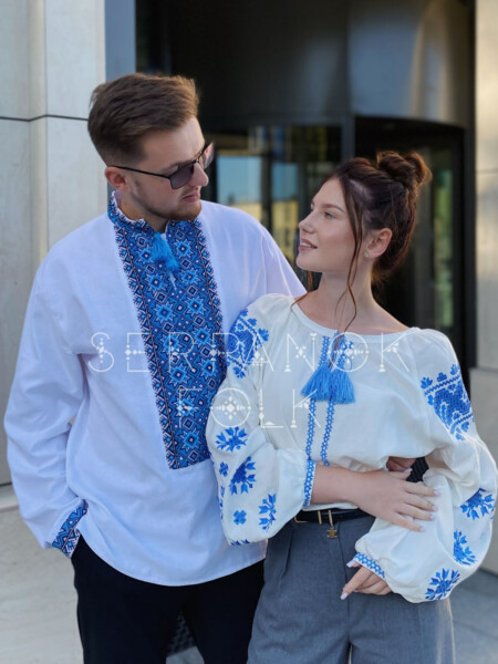 Парні святкові вишиванки сучасні білі з блакитною вишивкою “Смарагдові зорі”