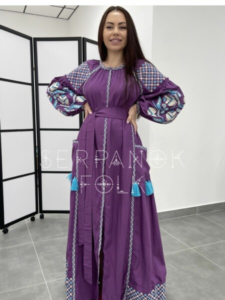Виготовлена з легкого шифону, ця сукня дарує відчуття комфорту та легкості, завдяки своїй повітряній тканині, що плавно драпірується по тілу.Чорний фон відмінно підкреслює витончений орнамент, виконаний вишивкою, яка додає сукні вишуканості та символічної глибини. Пояс акцентує увагу на талії, роблячи образ більш жіночним та елегантним, а також дозволяє варіювати фігуру за власним бажанням.
