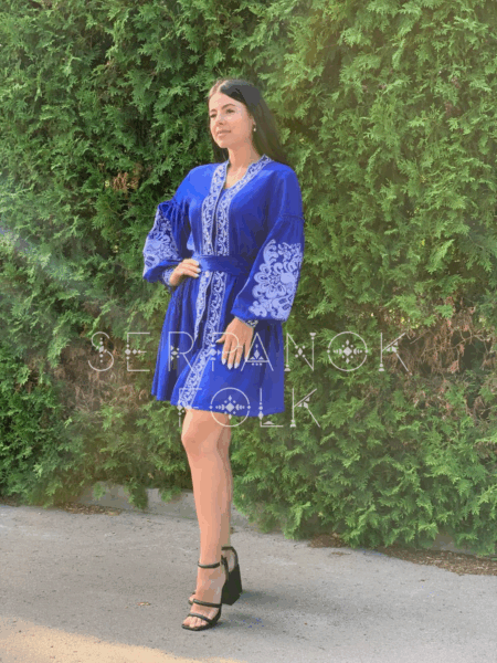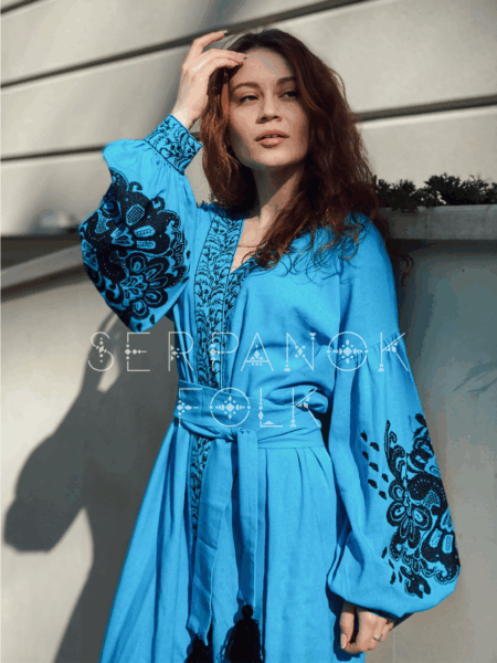Яскрава синя вишита жіноча сукня на лляній тканині в стилі бохо “Лукерія”