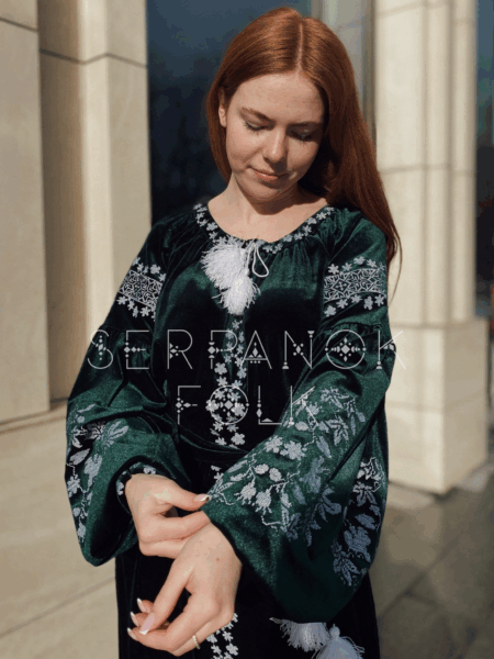 Зелена велюрова жіноча вишита сукня в стилі бохо з білою вишивкою “Сандра”