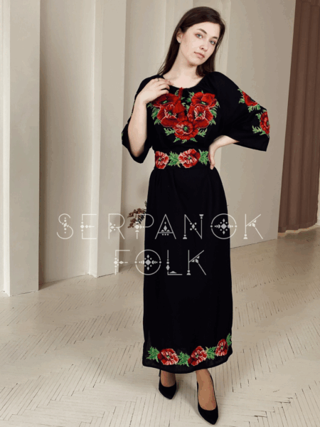Стильна жіноча чорна сукня вишиванка українська з квітами “Макова муза”