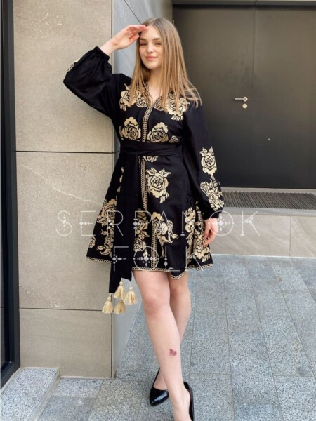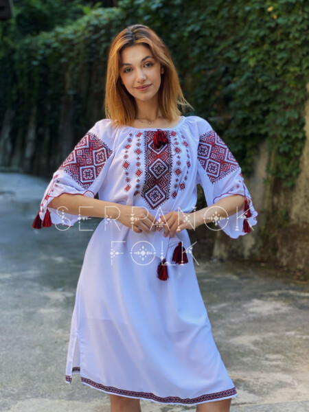 Жіноча вишита сукня на лляній тканині молочного кольору “Макош”- це чудовий вибір для тих, хто любить короткі сукні з вишивкою.