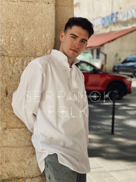 Чоловіча вишиванка білим по білому на домотканому полотні “Северин”