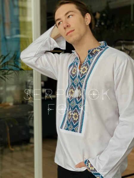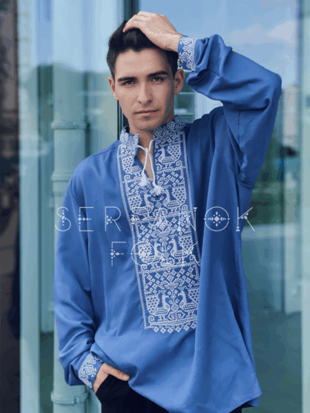 Блакитна чоловіча вишиванка на лляній тканині з білою вишивкою “Ярема”