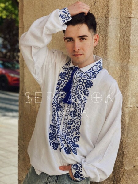 Чоловіча біла вишиванка на домотканому полотні з синьою вишивкою “Дубовий гай”