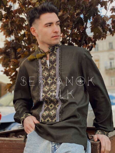 Чоловіча вишиванка хакі на лляній тканині з геометричним орнаментом “Кармалюк”