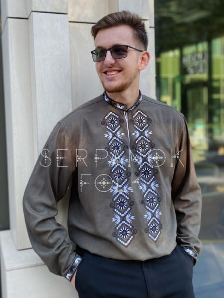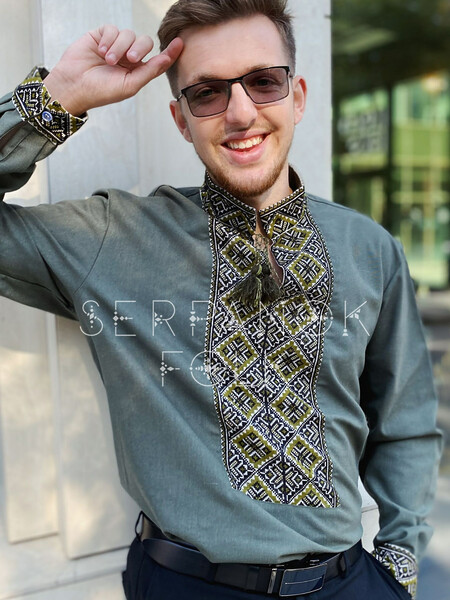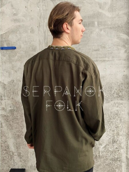 Чоловіча вишита сорочка з ручною вишивкою кольорі хакі “Захар”