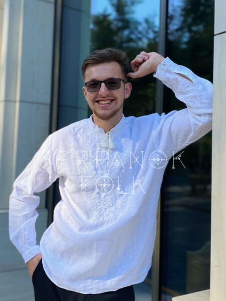 Святкова чоловіча вишиванка білим по білому на лляній тканині “Ярослав”