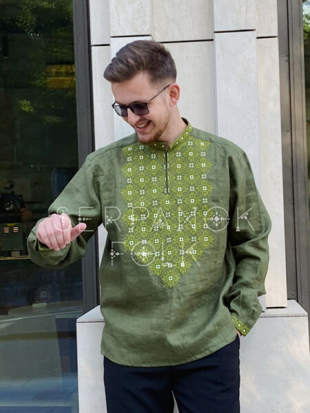 Стильна зелена чоловіча вишиванка на лляній тканині “Світозар”