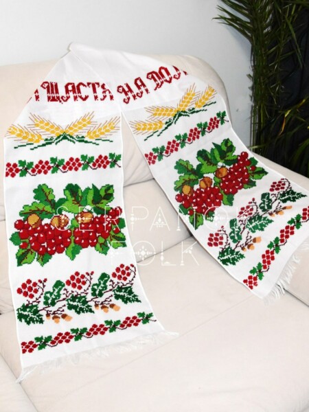 Кольорова вишивка з жовтими елементами створює святковий і яскравий вигляд. Цей рушник ідеально підійде для весільного обряду, адже він символізує традиції та злагоду в сім’ї. Ручна вишивка надає виробу унікальності та вишуканості, що робить його відмінним подарунком або частиною українського національного вбрання.