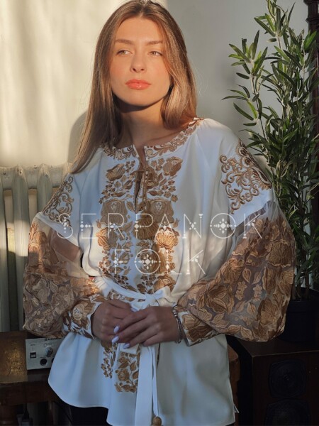 Стильна жіноча вишита блуза в стилі бохо з золотистою вишивкою “Романтика”