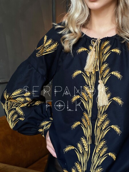 Чорна елегантна жіноча блуза на домотканому полотні з золотим колоссям “Жаннет”