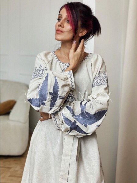 Вишукана жіноча українська сукня на лляній тканині з ластівками “Ельза”