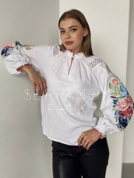 Офісна біла квіткова жіноча вишита блуза з трояндами “Корделія”