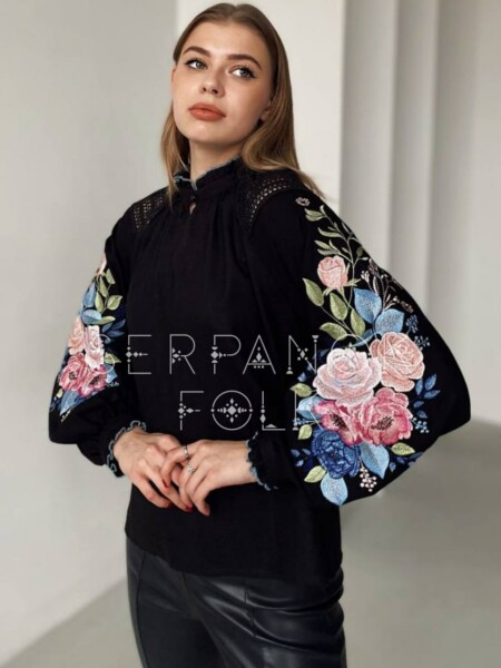 Стильна чорна жіноча блуза вишиванка з квітами та мереживом “Корделія”