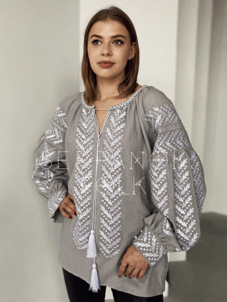 Українська сіра вишита жіноча блуза з білими колосками “Сильвія”