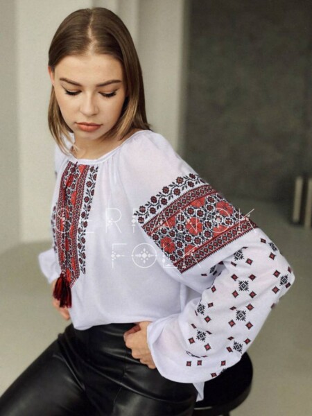 Традиційна українська біла жіноча вишиванка з червоно чорною вишивкою “Ярина”