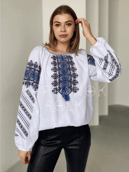 Традиційна українська біла жіноча вишиванка з синьою вишивкою “Гуцулка Ксеня”