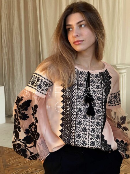 Стильна персикова жіноча блуза вишиванка з квітковим орнаментом “Марфа”